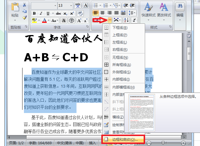 点击下三角,在弹出的下拉列表 中,找到“底纹和边框”