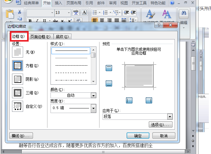 word2007的边框和底纹在段落的对话框中可以设置,具体操作请参照以下步骤。