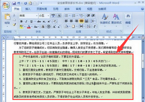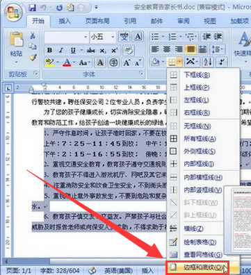 1、打开Word 2007文档,选中需要设置图案底纹的段落。在“开始”功能区的“段落”分组中单击“边框”下拉三角按钮,并在打开的边框下拉列表中选择“边框和底纹”。