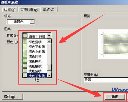 2、在打开的Word 2007“边框和底纹”对话框中切换到“底纹”选项卡,在“图案”区域分别选择图案样式和图案颜色,并单击“确定”按钮即可。