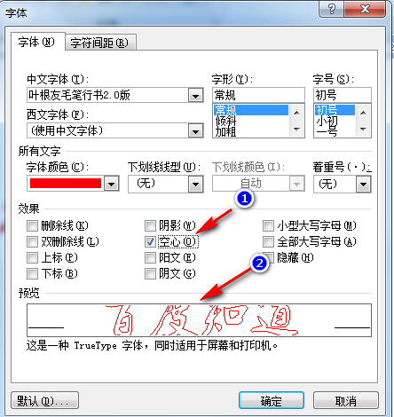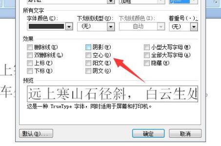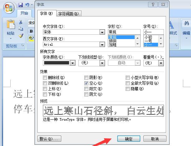 2、在字体设置中,勾选“空心”,确定。