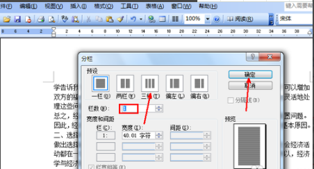 4、在分栏设置页中,有一系列选项,其中第一项,就是分成几栏的设置,我们可以看到有一栏两栏三栏,也可以自定义。在这里我们把这篇文章分成三栏的样式,就点击三栏的那个预设图,然后点击确定。