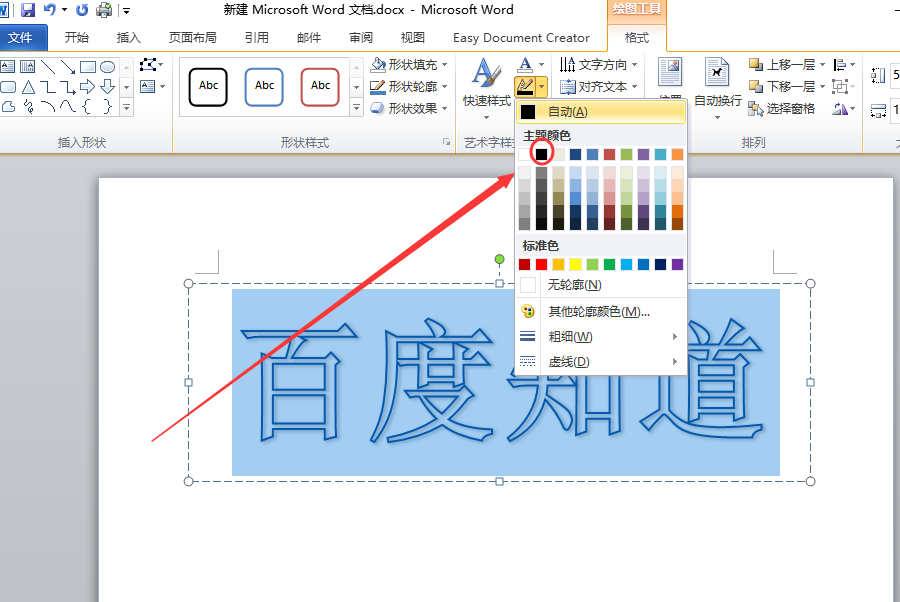 3、点击“文本轮廓”旁边的下拉按钮,并选择“黑色”,把空心字设置为黑色即可。