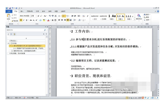 第二步:设置同级标题很简单,选中刚才设置的标题一标题,然后点击“开始”-》“剪贴板”标签中的“格式刷”按钮,把其他为标题一格式的标题刷一遍,此时左边的“导航也会自动生成”,如下图: