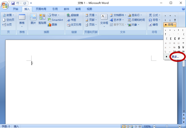 第二步:点击菜单栏中的插入,之后看最右面,点击最右方的符号,可以看到最下方有一个更多的选项,点击这个选项。