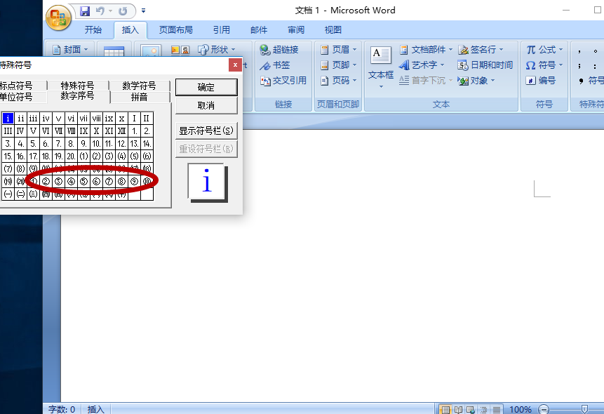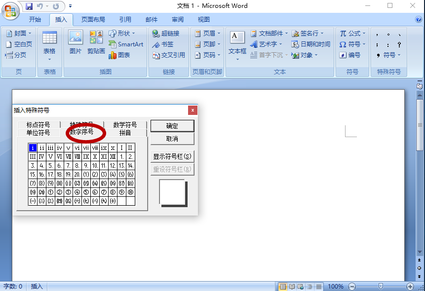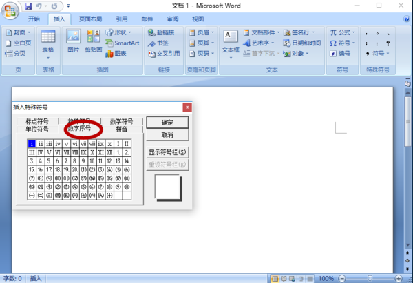 第三步:这时出现一个插入特殊符号的选项框,然后就可以点击数字序号。