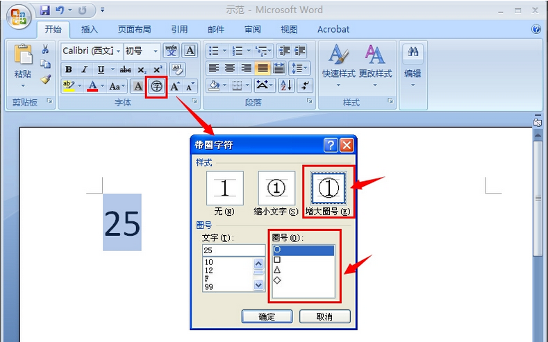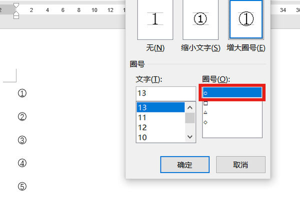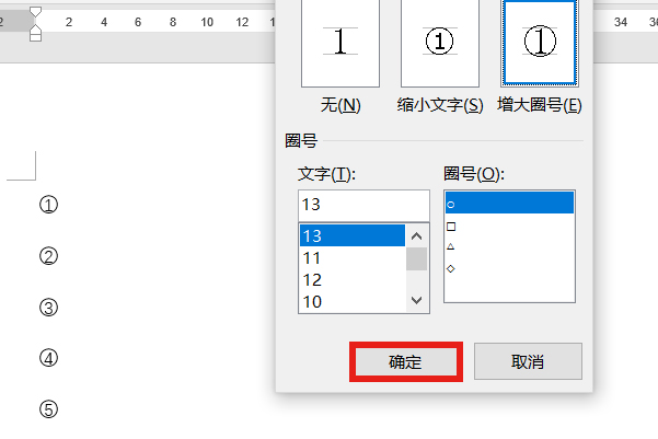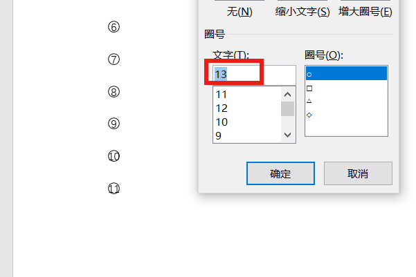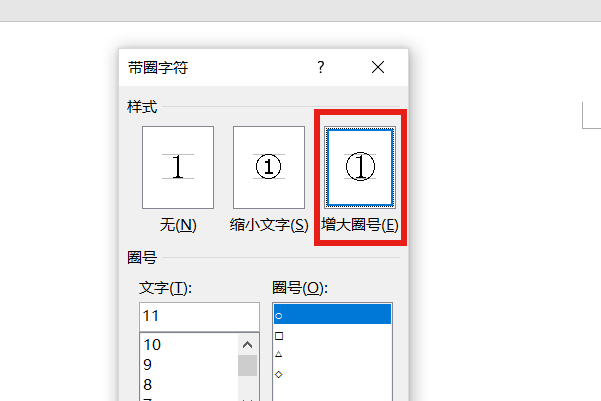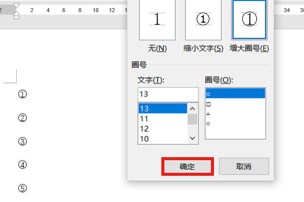 2、在样式下面选项中选择一个带圈样式,可选“缩小文字”或“增大圆圈”,然后在下面的文字输入框中输入所需数字,并点击下方的确定按钮。