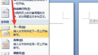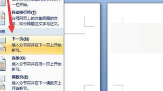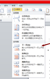 如果我们希望给某一页设置单独的页眉页脚,则需要将此页单独分节。首先将光标定位到当前页第一个字符之前,切换到“页面布局”功能区,点击“分隔符”下拉菜单中,从中选择“分节符”-“下一节”项。