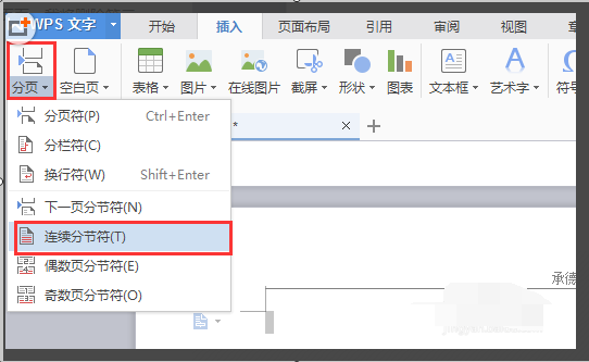 2、选择菜单栏中的“插入”,选择“分页”的图标,在下拉菜单中选择“连续分节符”选项。
