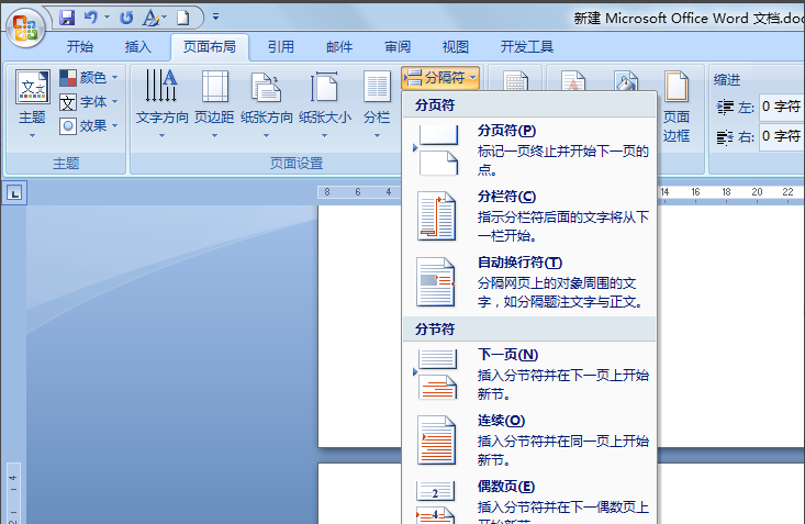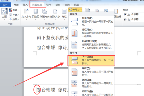 接着将光标定位到当前页最后一个字符后面,同样的方法:点击“分隔符”下拉菜单中,从中选择“分节符”-“下一节”项。
