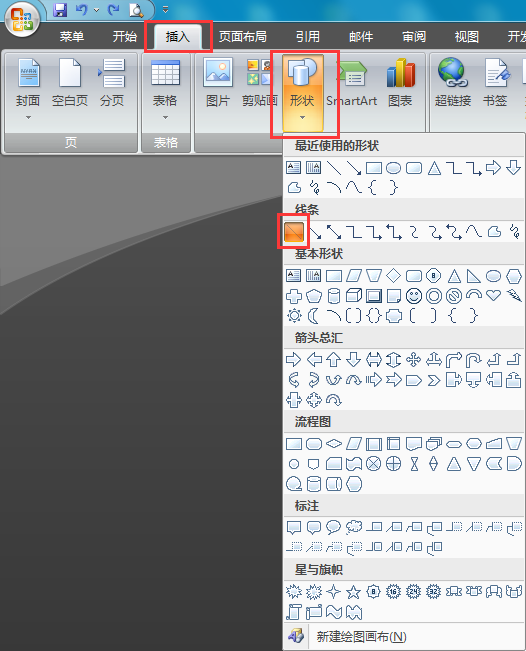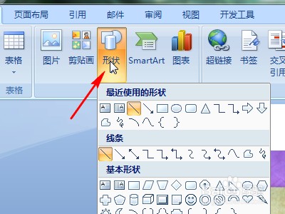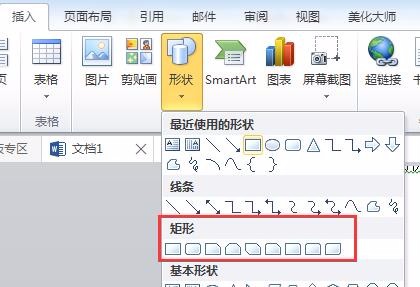 1、打开word2010文档 ,点击“插入”中的“形状”,在“矩形”中选择某个矩形类型,如图: