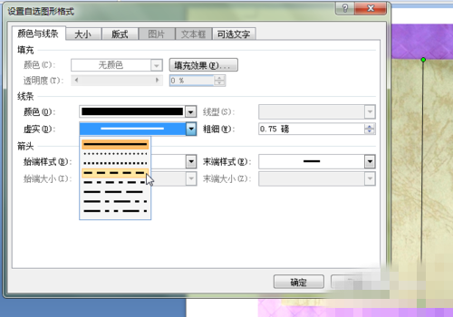 【5】这样会出来一个对话框,在“颜色与线条”选项卡里在“线条”的“实”选择一个适合的虚线,这里选择的是“短划线”。然后按确定,线条就变成了虚线了。