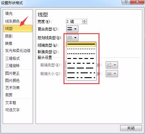 3、在“线型”中的“短划线类型”中选择某种虚线类型,然后按“关闭”按钮,如图:
