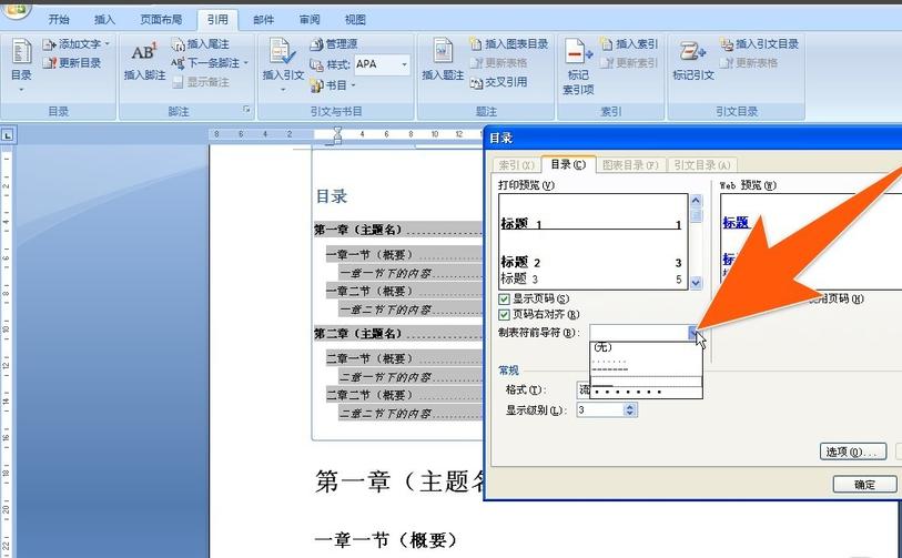 3、在弹出的目录设置窗口中,可以点击下图箭头所指处,选择不同的前导符的样式