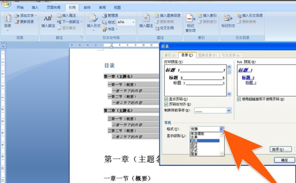 有很多目录格式的选项可以设置,如要不要显示页面,页面是否右对齐,显示制表符,显示几个级别等。