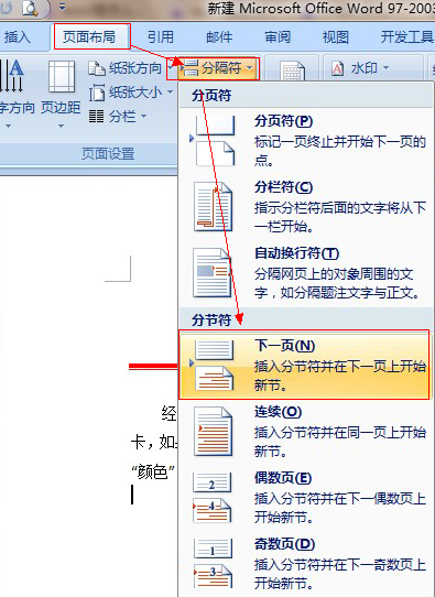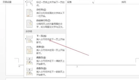 选择“页面布局->分隔符”,打开“分隔符”对话框,在“分隔符类型”下单击选中“下一页”单选钮。