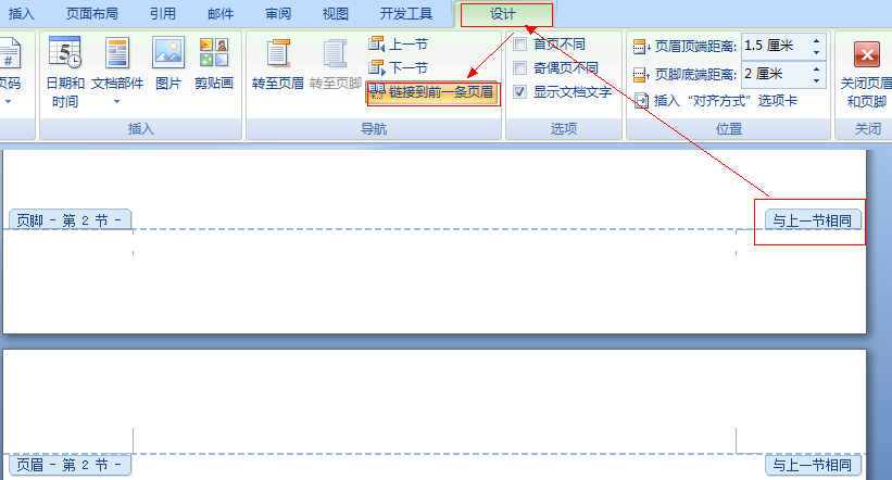 断开链接:选中“”,单击“链接到前一条页眉”按钮,断开同前一节的链接。