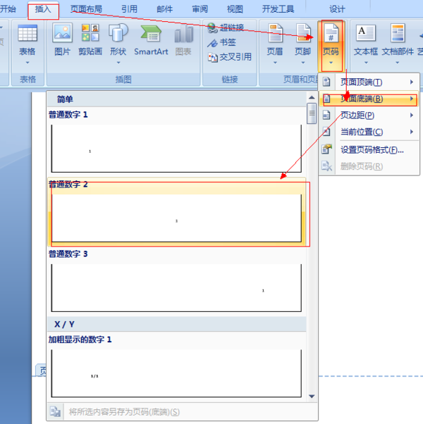 插入页码:选择“插入—>页码—> 页面底端”,选择“普通文字2”。
