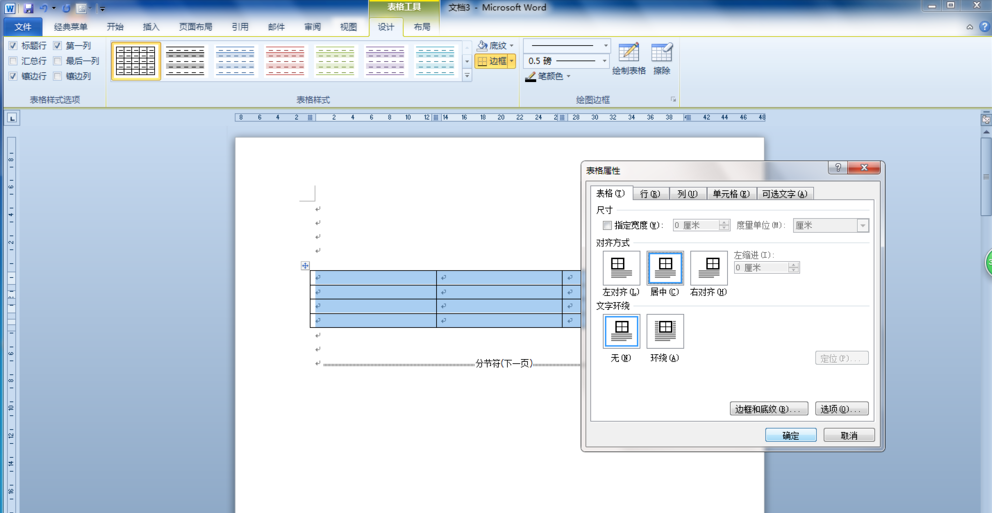4、在“表格属性”对话框中选择“文字环绕:无”,然后单击“确定”。