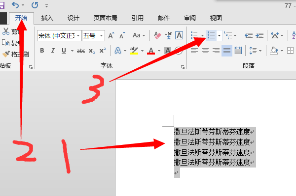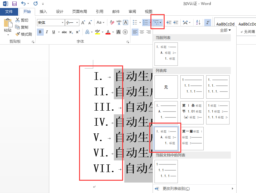 2、在开始栏,点击编号或者多级列表,则自动生成了序号,如下图: