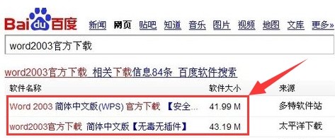 在百度网页输入“word 2003 下载”或者“office 2003 下载”就会出现很多下载网站,选择一个网站点开,找到并点击“下载”按钮,选择保存路径,下载