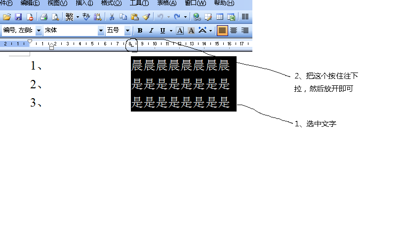以我的为例,应该就是你描述的问题。红色选中部分是制表位指针,按着鼠标左键沿标尺拖动可进行调节……