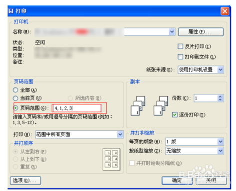 4、又回到打印界面进行关键设置,就是数字参数的设置,在页面范围里设置 4,1,2,3 (以4页为例)这点是正确输出小册子的关键因素之一。