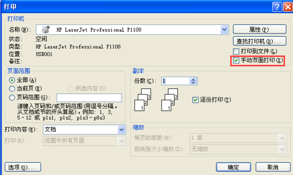 把打印:范围中所有页,改为奇数页,打印后,再把印装进去,如上打印偶数页,注意自己较对一下顺序,别把第1和第2页打到一起了。