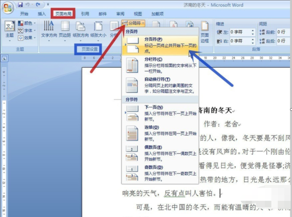 2、点击顶部“页面布局”选项卡(图中红框)中的“页面设置”功能组(图中蓝框)中的“分隔符”(图中红色箭头所指),在弹出的对话框点击“分页符”(图中蓝色箭头所指)