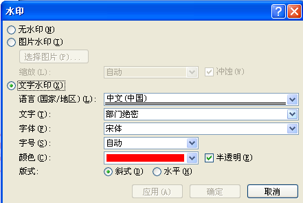 制作好文档后,在“格式”菜单下“背景”中选择“水印”选项,选择“文字水印”,在“文字”菜单中选择水印的文字内容,也可自定义水印文字内容。设计好水印文字的字体、尺寸、颜色、透明度和版式后,确定应用,可以看到文本后面已经生成了设定的水印字样。