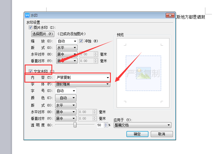 把文字水印打上勾之后在内容里面去把内容输入进去即可