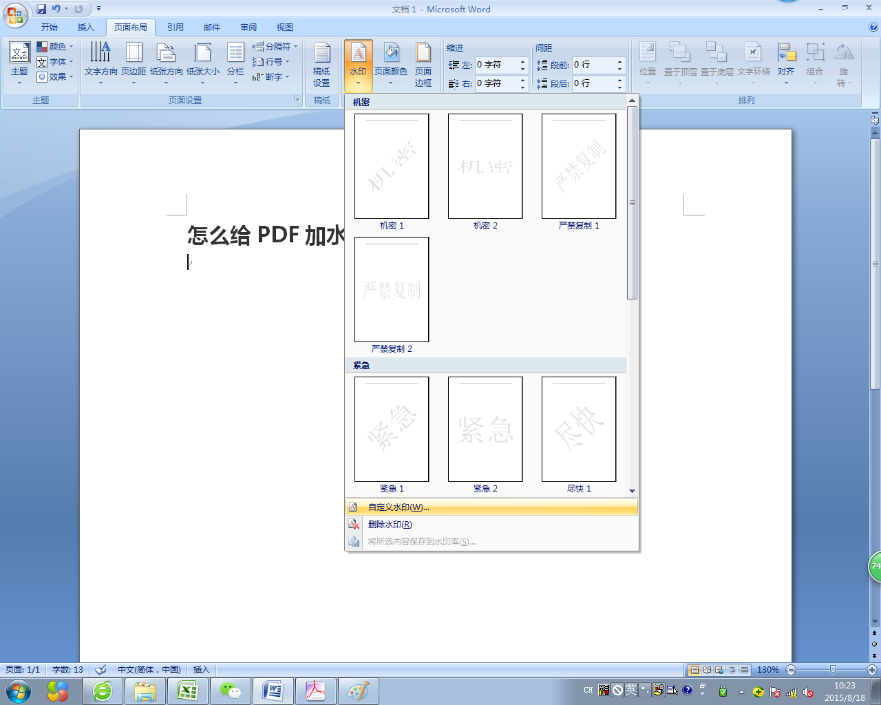 4、单击页面布局----水印按钮----自定义水印;