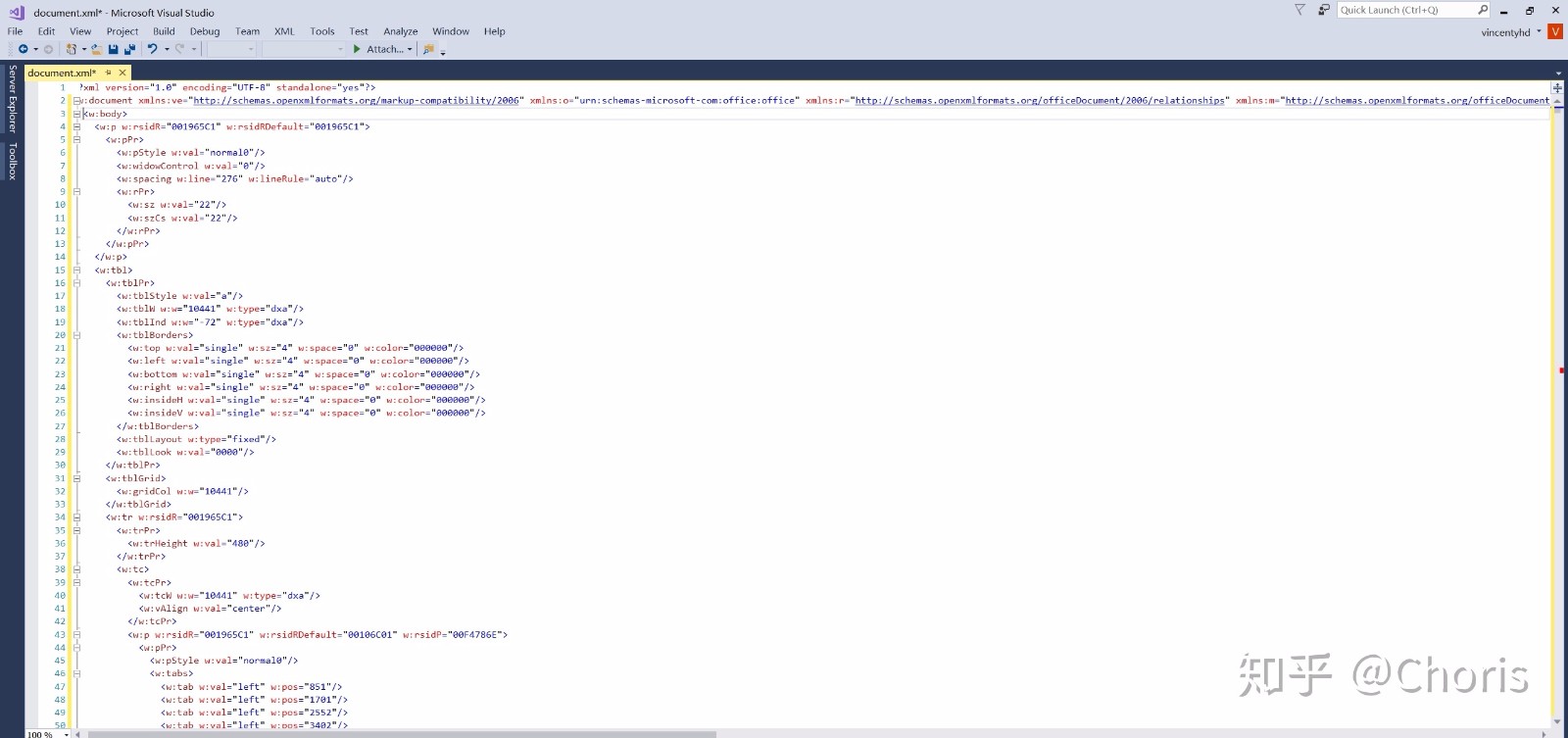 解压.zip文件,然后我们得到一个文件夹,打开里面的word子文件夹,然后打开word中的VISUAL STUDIO, 并打开document.xml文件。