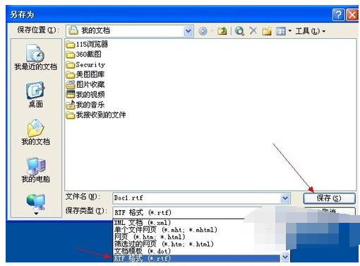 3.在【另存为】窗口单击“保存类型”,在下拉列表中选择【RTF格式(*.rtf)】,单击【保存】按钮。