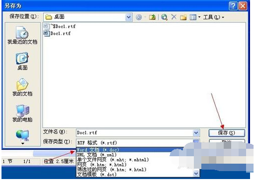 在【保存类型】列表中选择【Word文档(*.doc)】,单击【保存】按钮
