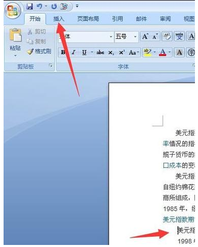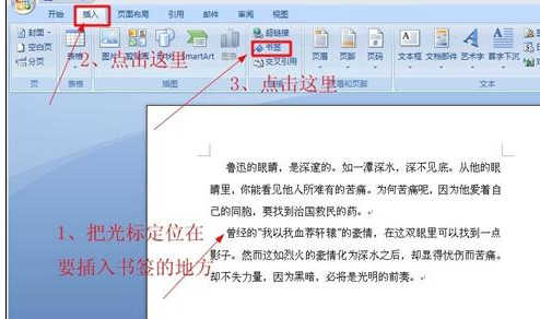 步骤二:比如要把书签插入到第二段的前面,就先把光标定位到那里。然后点击word上面菜单栏的“插入”