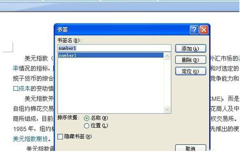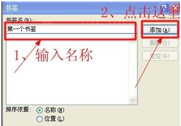 第2步,打开“书签”对话框,在“书签名”编辑框中输入书签名称(书签名只能包含字母和数字,不能包含符号和空格),并单击“添加”按钮即可
