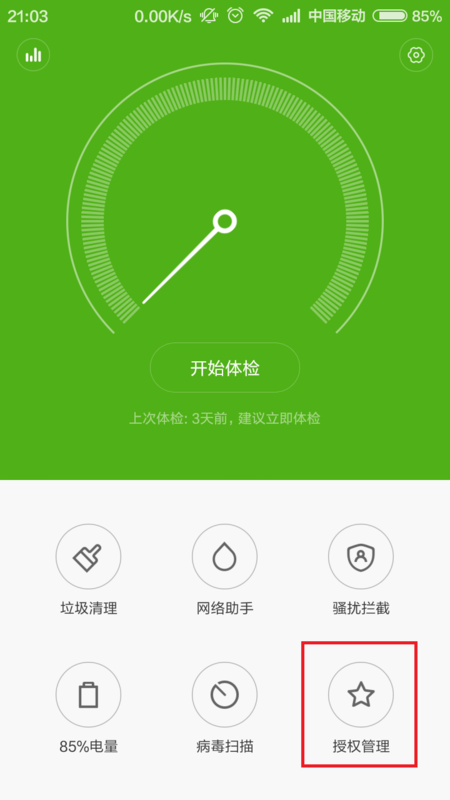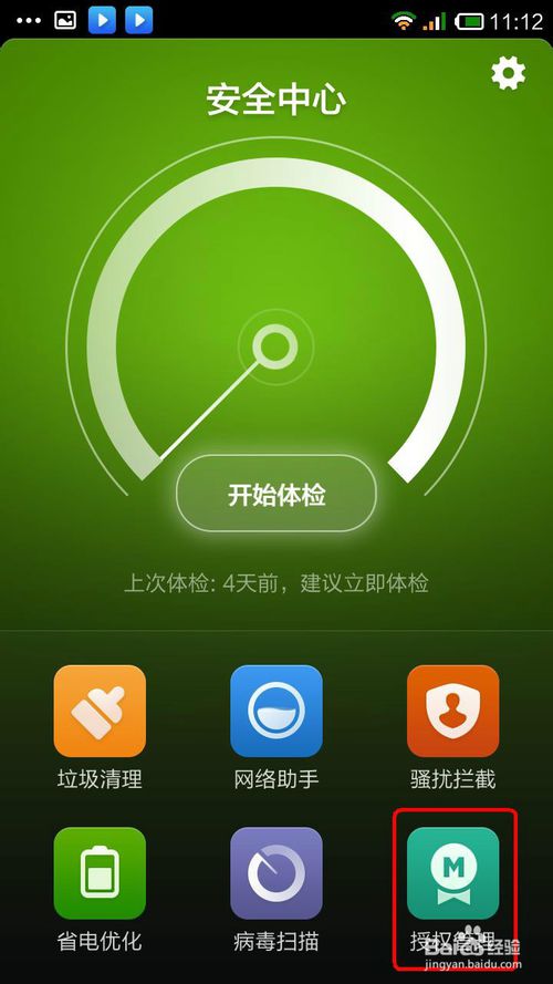 1、以MIUI系统为例,打开手机系统中的安全中心应用,点击选择“授权管理”选项。