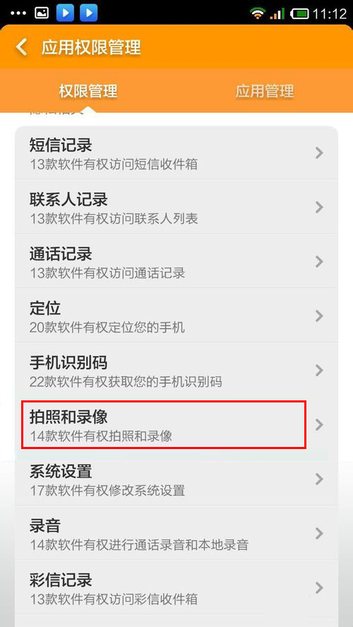 4.进入权限管理选择拍照和录像。