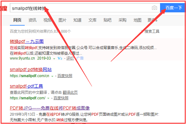 1、首先在百度搜索smallpdf在线转换,然后点击【百度一下】。