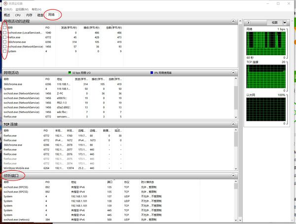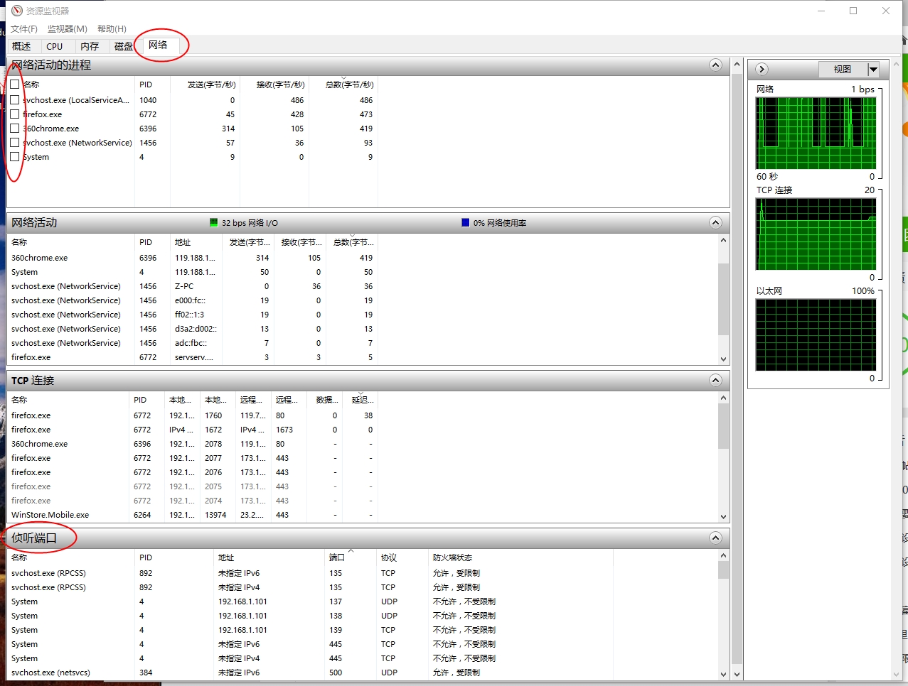 (3)在“资源管理器”里,点击“网络”,在“网络活动的进程”中勾选需要查询的进程,这时最下面一栏“侦听端口”就会显示这个进程(软件)所使用的端口了: