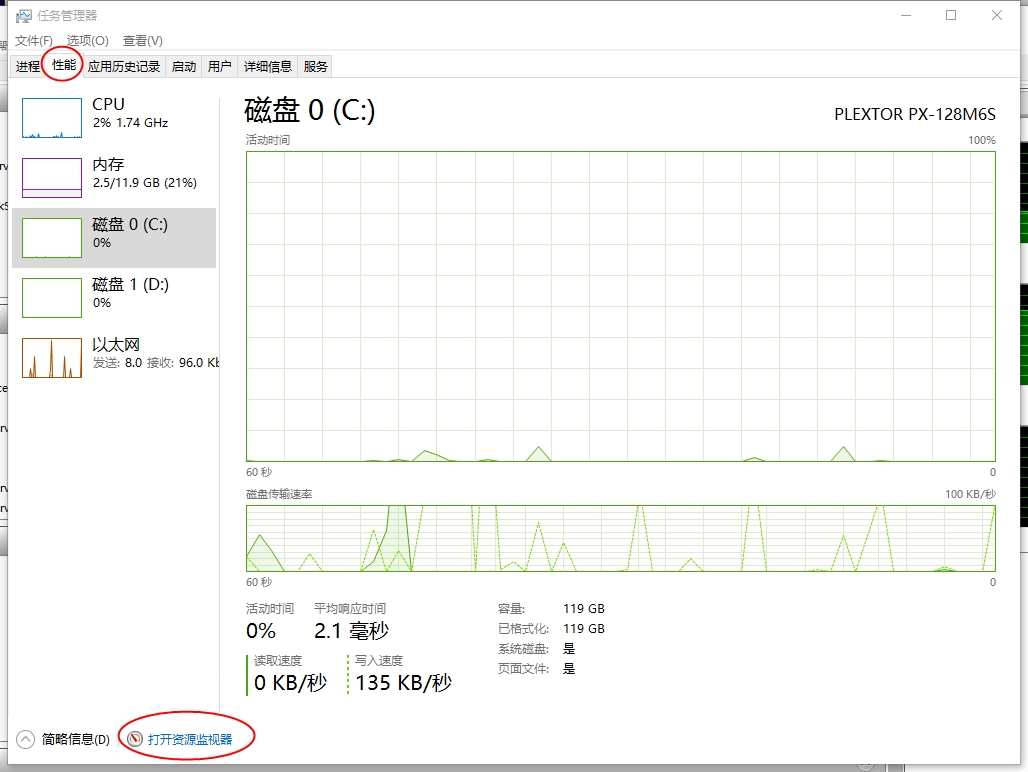 (2)如下图红色圆圈标记,在“任务管理器”里,切换到“性能”选项卡,再点击“打开资源管理器”: