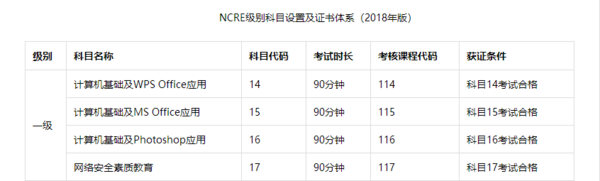 科目:计算机基础及MS Office应用、计算机基础及WPS Office应用、计算机基础及Photoshop应用、网络安全素质教育,一共四个科目。