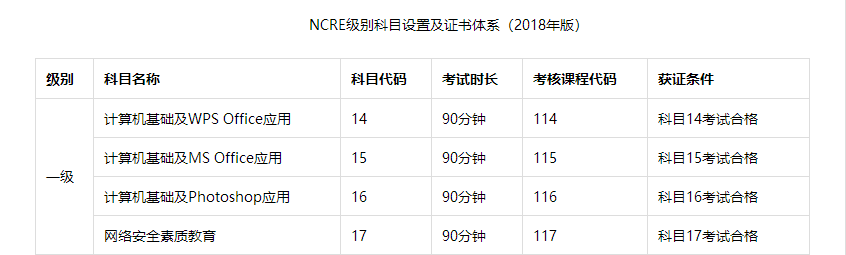 一级MS Office、一级WPS Office、一级Photoshop,一级共三个科目。