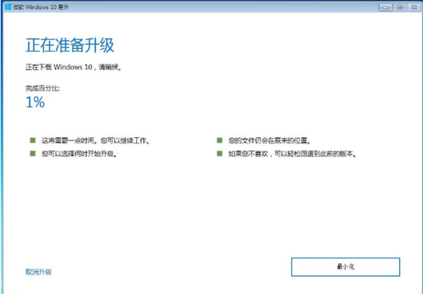 4.启动win10升级程序,为确保能正确升级win10,会进行电脑硬件的再次检测,保证无误后开始安装过程。如下面图示: