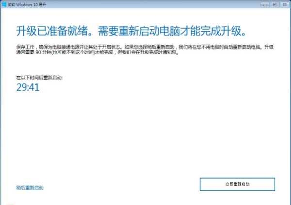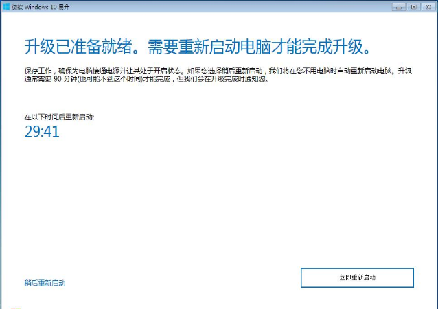 5.以上步骤完成后提示用户重启电脑进行下一步的操作,未操作一段时间后将自动重启进入更新过程。