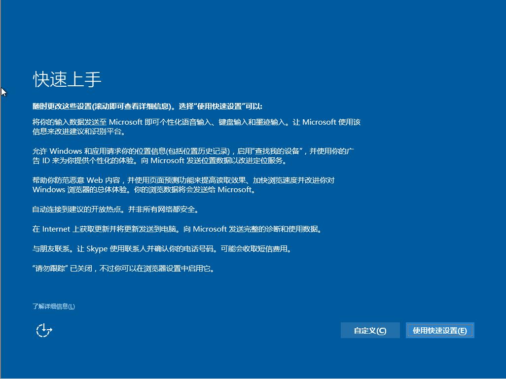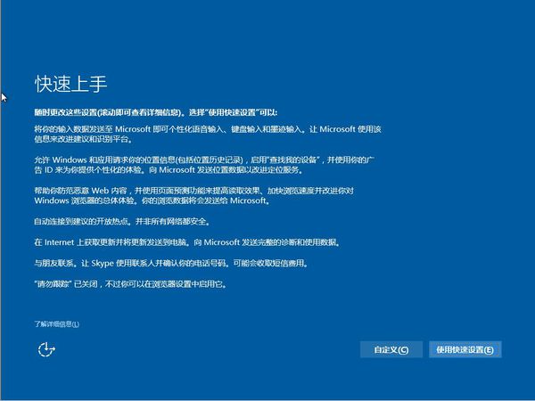 7.更新过程完成后进入系统设置界面,对升级好的win10系统进行简单的设置。这里点击自定义设置或使用快速设置。