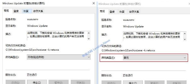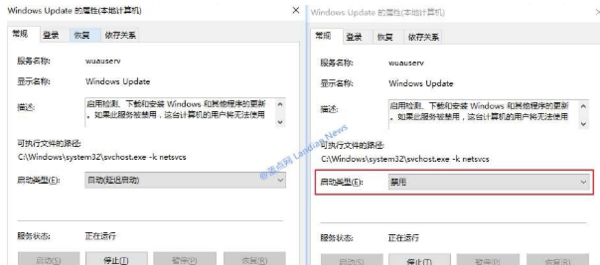3、在属性中将默认的Windows Update服务项自动启用或自动延迟启动修改为禁用并点击下方的确认按钮。