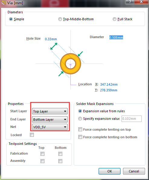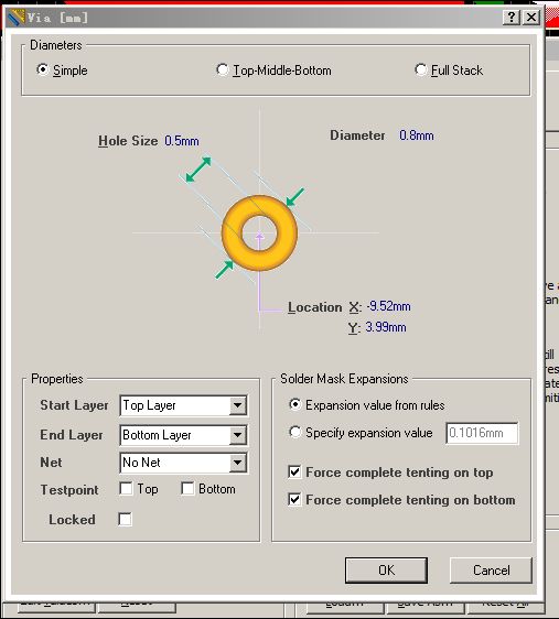 4.补充:当双击焊盘时,出现的对话框,可以看到信息,放置过孔形成网络自动生成,如图: