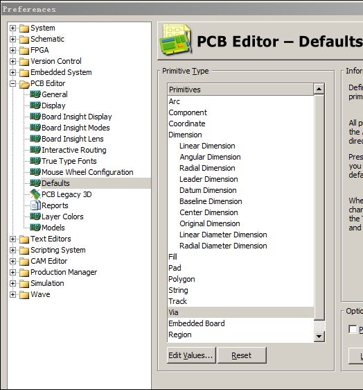 菜单Tools_Preferences中,在PCBEditor栏有Default项点击之,找到Via,双击之,可设置Via的默主过孔参数